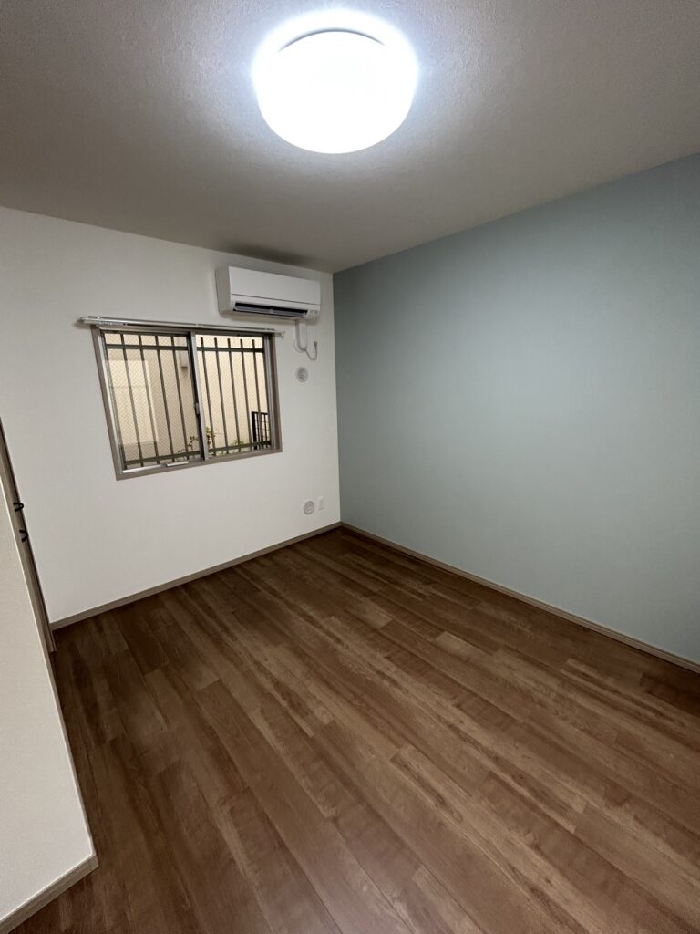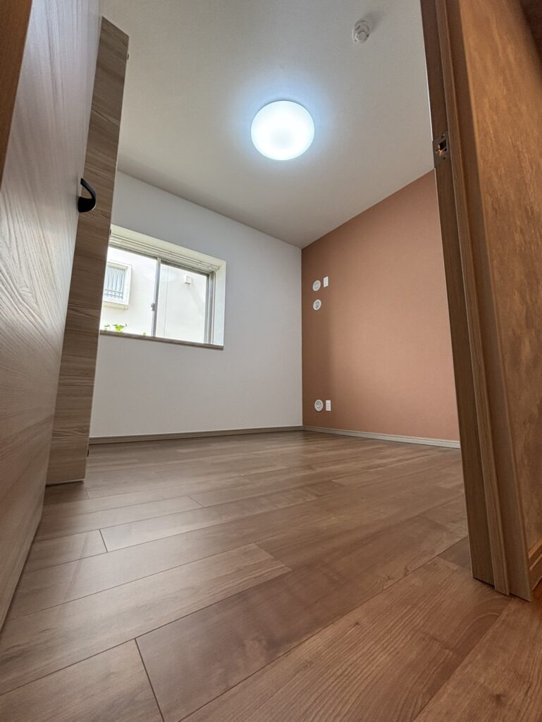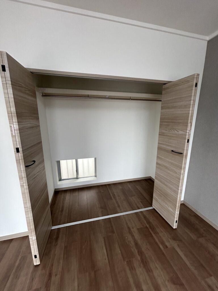玄関脇の洋室、ここは元々収納付きのお部屋ですが、壁紙の一部にアクセントを入れ収納とドアを木目で統一しました!